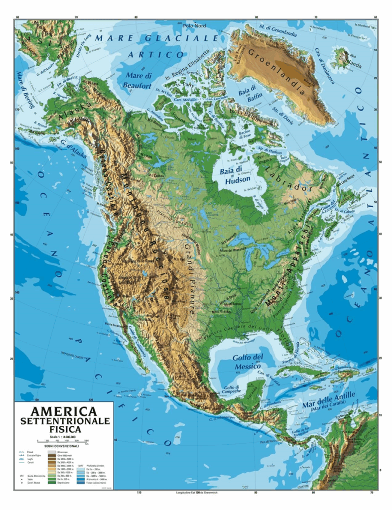 Diamo qualche numero: il Nord America compreso il Messico è composto da circa 24,5 kmq, rappresenta più del 55% di tutte le Americhe, quasi il 16% di tutte le terre emerse nel mondo e in generale è circa il 4,6% dello spazio del pianeta. Da un punto di vista geografico è formato da paesaggi molto diversi: la catena delle Montagne Rocciose a ovest e i Monti Appalachi a est, poi ci sono le vaste Grandi Pianure centrali e lo Scudo Canadese. Inoltre ci sono fiumi lunghissimi con tutte le diramazioni anche artificiali e la zona dei grandi laghi. Per questo natura così florida è stata considerata una terra di conquista per le popolazioni europee, noncuranti come sappiamo della sorte degli indigeni. Il clima varia fra quello polare al nord del Mar Glaciale Artico, al clima continentale freddo nelle aree centrali, fino al subtropicale nella zona del Golfo del Messico. Attualmente vi abitano circa 530 milioni di abitanti.