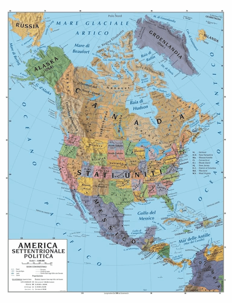 Il primo luogo geopolitico extraeuropeo che ho scelto è l’America Settentrionale. Questo perché vi troviamo gli Stati Uniti che angora oggi rappresentano il primato mondiale in tutti i campi, nonostante il periodo di grande difficoltà che stanno attraversando. Gli USA determinano e influenzano molte aree geografiche del mondo, prima fra tutte l’Europa: per questo dal nostro punto di vista di italiani non possiamo non analizzare per primo il Nord America e la sua influenza nel mondo.